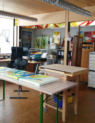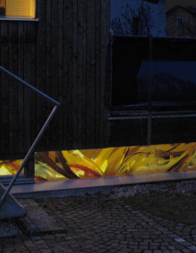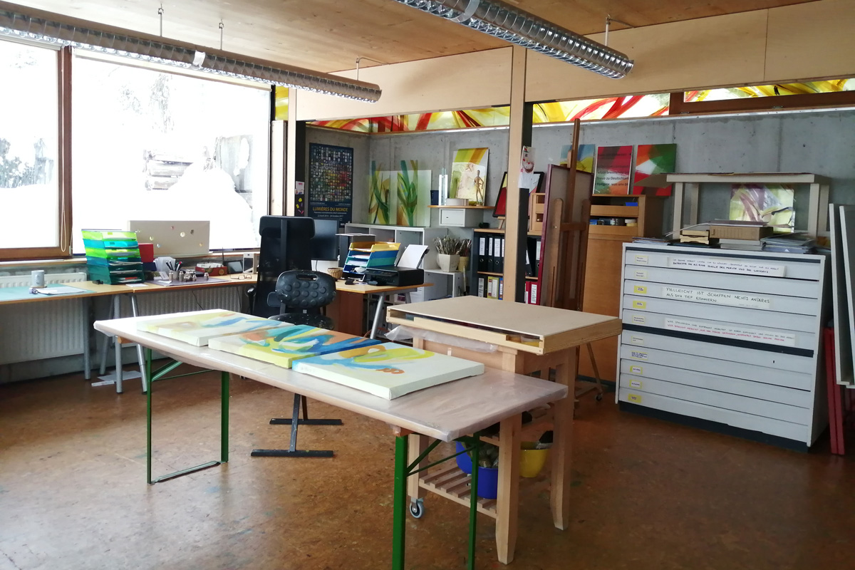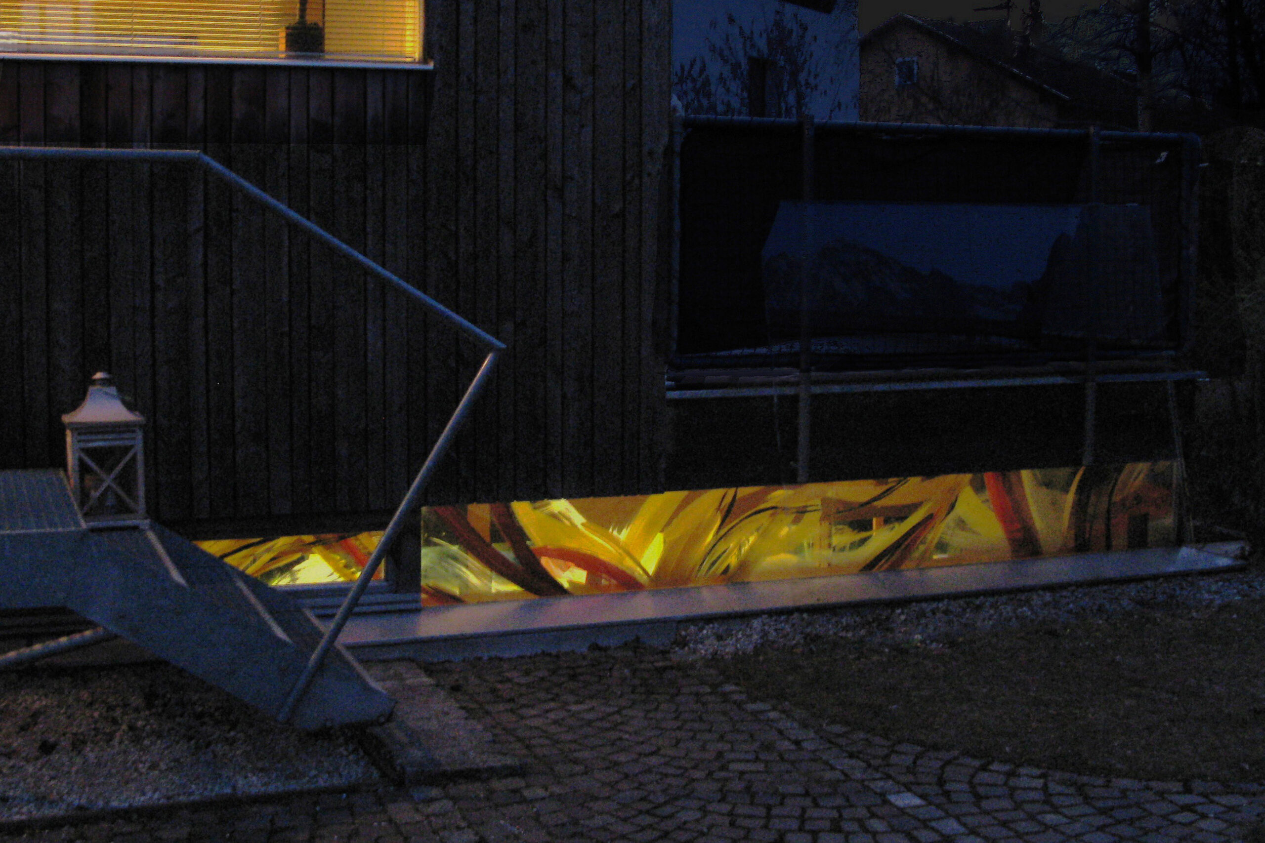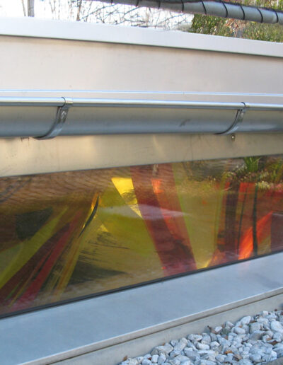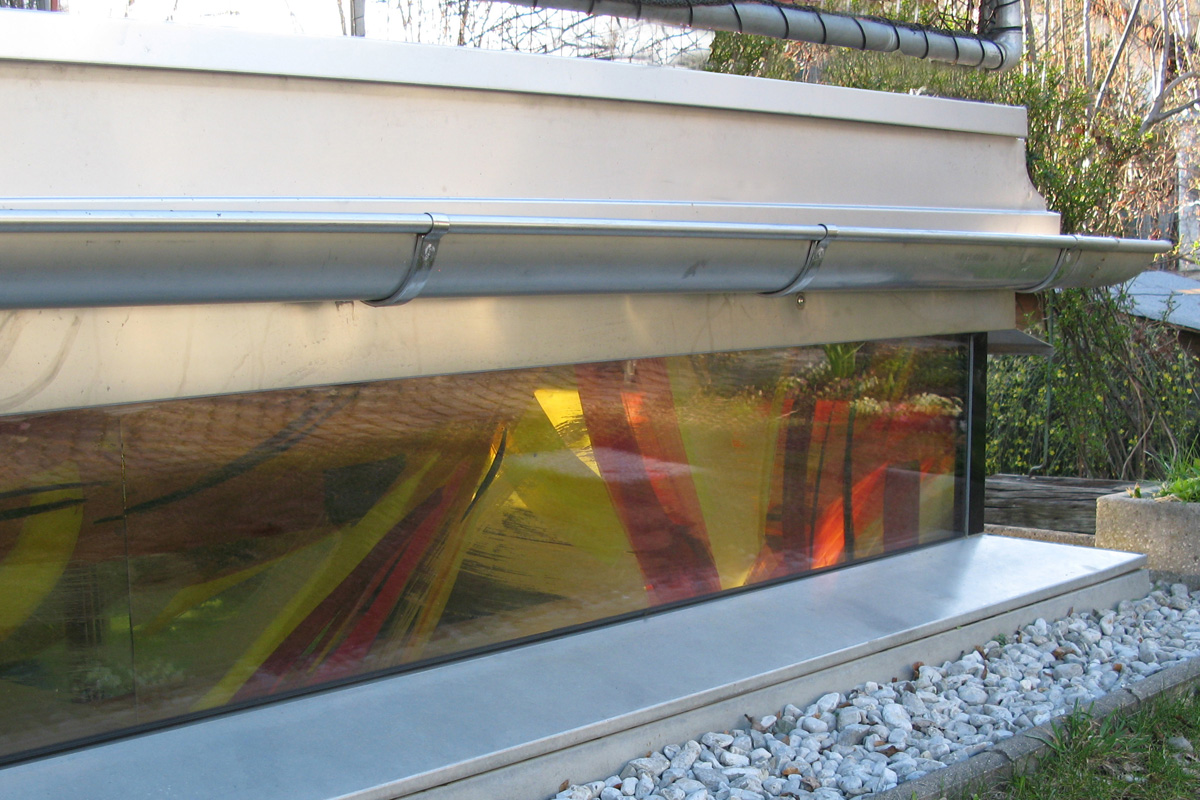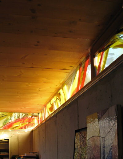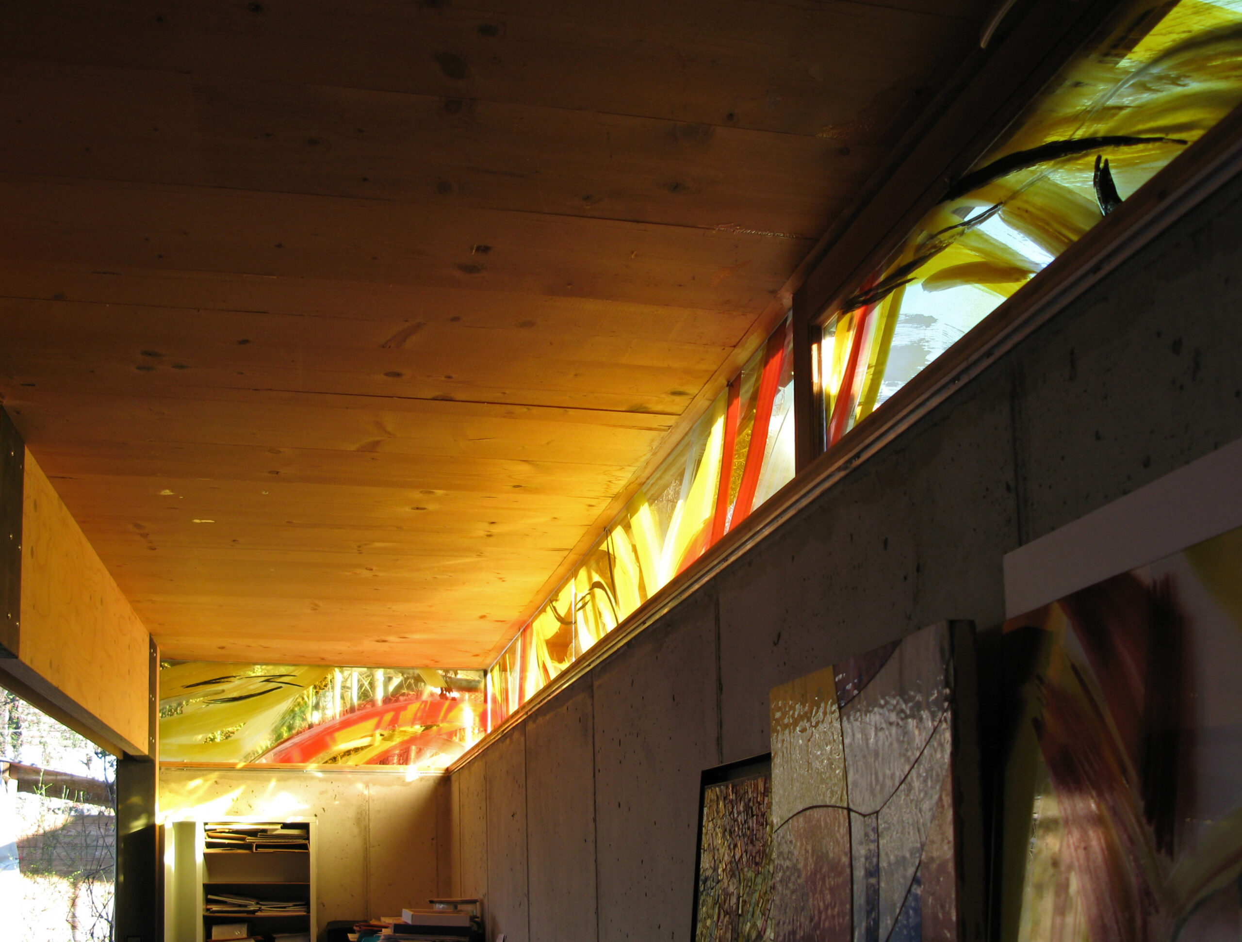 Die handbemalten Gläser der Oberlichten verleihen dem Atelierraum eine besondere Atmosphäre. Bei Tag wie Nacht schützen sie vor direkten Einblicken, indem sowohl transparente als auch opake Farben parallel aufgetragen und einzelne Partien geätzt wurden.